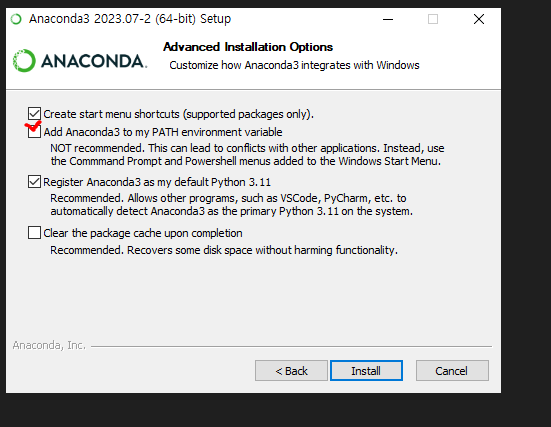 저기 두 번째 Add Anaconda3 to my PAYH~~ 도 꼭 체크 해주셔야 합니다!!
