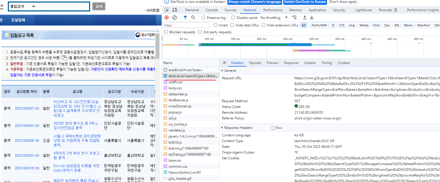 "Cookie": "ccsession=2023100518303100000ad00ad07afe; ccguid=2023100518303100000ad00ad07afe; ipmsperf_uuid=-480776048976768909; _KONEPS_PAGE=%3C%21%23%25%3EtbidListUrl%3C%40%25%7E%3E%2Fep%2Ftbid%2FtbidList.do%3Farea%3D%26areaNm%3D%26bidNm%3D%26bidSearchType%3D1%26budgetCompare%3D%26detailPrdnm%3D%26detailPrdnmNo%3D%26downBudget%3D%26fromBidDt%3D2023%252F04%252F04%26fromOpenBidDt%3D%26industry%3D%26industryCd%3D%26instNm%3D%26instSearchRangeType%3D%26intbidYn%3D%26orgArea%3D%26procmntReqNo%3D%26radOrgan%3D1%26recordCountPerPage%3D100%26refNo%3D%26regYn%3DY%26searchDtType%3D1%26searchType%3D1%26setMonth1%3D3%26strArea%3D%26taskClCds%3D5%26toBidDt%3D2023%252F10%252F05%26toOpenBidDt%3D%26upBudget%3D; JSESSIONID=MGpvlpGJdvZpbvgg1ZKrFJJcXpdpckfGqypy6hqJK1zv6tNqQFMx!71603225",