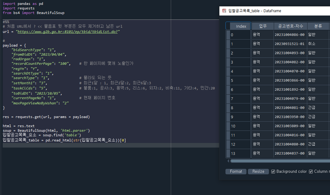 셀레니움(selenium) 나라장터 데이터 수집하기 2/4 (DataFrame 다루기 및 HTML 파싱)