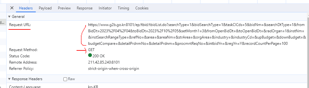 먼저 헤더스 텝에서, requests 방법을 어떤 걸 쓰는지 확인해야 해요, 이번 포스팅에서는 GET 방식을 이용했네요