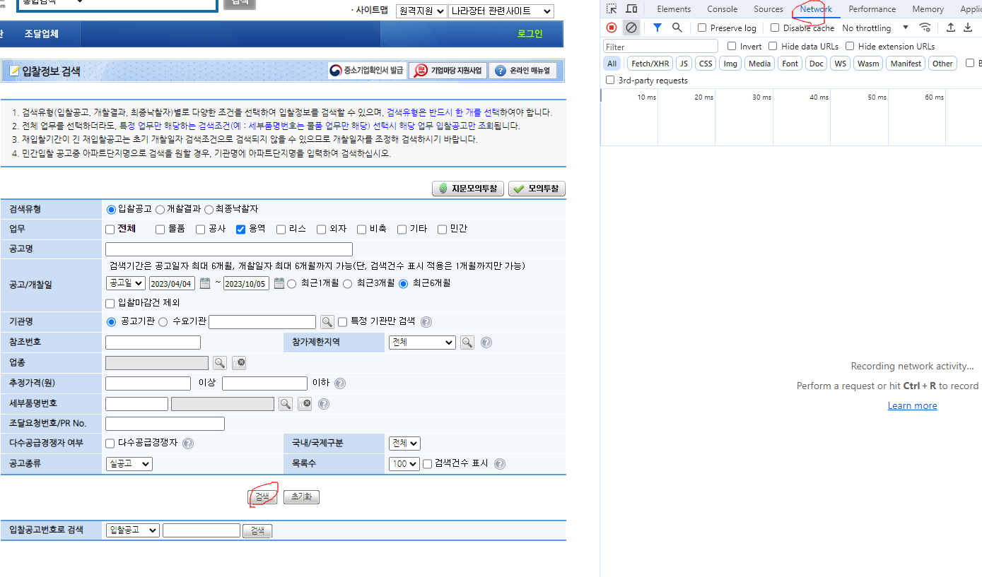 검색 버튼을 누르기 전으로 돌아가서, 네트워크를 열고 검색 버튼을 눌러보겠습니다!